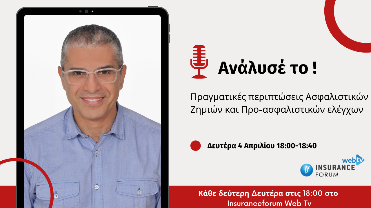 Η εκπομπή «Aνάλυσέ το» μεταδίδεται από το insuranceforum web tv, από τη σελίδα μας στο Facebook καθώς και από το κανάλι της Insurance Innovation στο Youtube κάθε δεύτερη Δευτέρα στις 18:00!