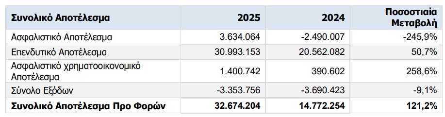 Το δεύτερο σημείο που βαραίνει είναι η ποιότητα αυτών των κερδών. Το ασφαλιστικό αποτέλεσμα το 2025 διαμορφώθηκε σε €3.634.064, ενώ το 2024 ήταν αρνητικό στα €-2.490.007. Η βασική δραστηριότητα πέρασε σε θετικό έδαφος. Τα ασφαλιστικά έσοδα ανήλθαν σε €103.801.142 και οι πληρωθείσες αποζημιώσεις έφτασαν τα €73.123.875. Το underwriting κρατά ισορροπία.